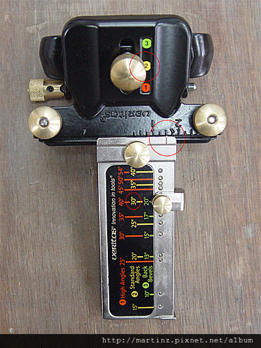 將磨刀器架上設定器,由上到下的設定是,第二號角度為黃色,就須與最下方的角度對應,所以這樣就是設定為30度,中間的設定是鑿刀寬度,藉由鑿刀寬度的設定,將刀具置在磨刀器的中央。