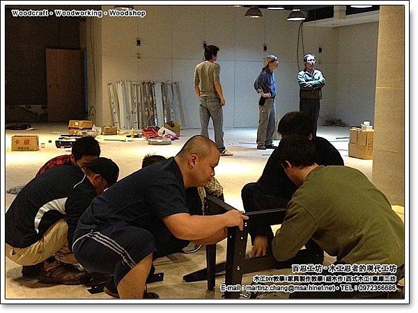 今天從下午1:30就到當代木工藝術研習所報到,主要的任務是收貨,自己出貨自己收,自己組,真是一個好玩的事,這次的夥伴有打火弟兄文祥哥,同學冠彰還有三名帥哥助教,要一起打拼,加上老師七個人,真的是七手八腳,一個下午要組五台機器,兩個治具真是過癮。