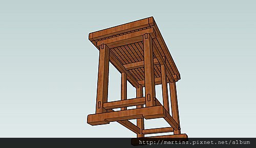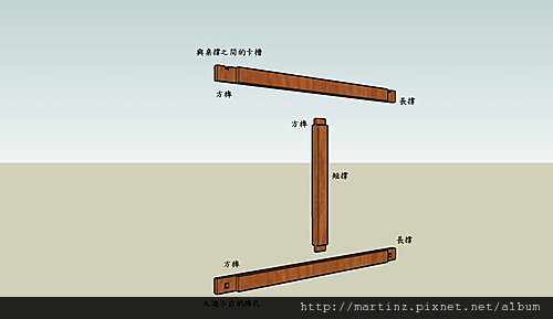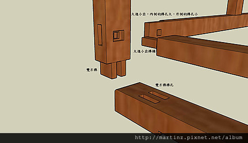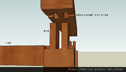 長撐與左右桌腳的連結後,前後片的短撐下,下方前後面又透過大進小出榫來卡住,有可能左右移動的長撐,如此一來就可以將單項連結,有可能發生的形變避免掉。