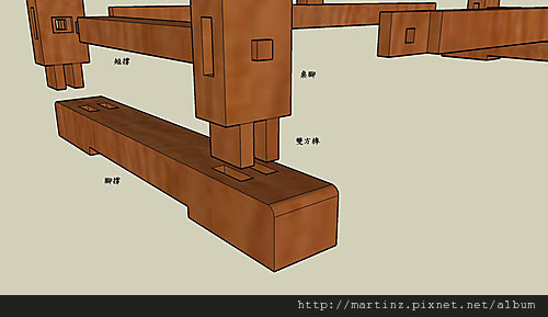 桌腳透過雙方榫與腳撐連結,雙方榫總共有兩個榫頭,當榫作的不夠密合時,也可透過木頭本身的彈性來容許些許的誤差,腳稱與上方的桌撐共同組成方型結構。