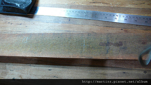 桌面是用角料透過螺桿上膠接合,成本精濟而且耐用,角料先標鑽孔點。