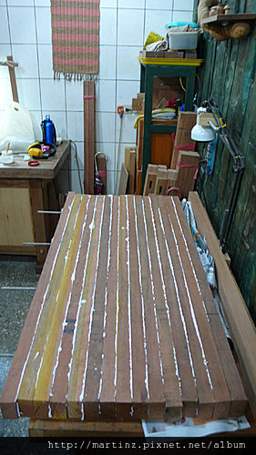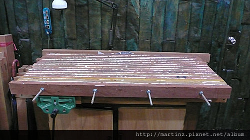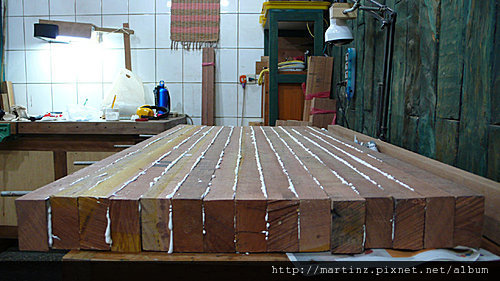 白膠的膠合,爆漿一般的木工師傅是不允許的,因為若是細木作貼皮要很快的用溼布擦掉,但是這整張的桌面還要刨平,所以就讓他爆漿,這樣可以絕對確定,每個角料間的膠合都很完整,讓膠的結構力發揮到最大,而且也可以讓膠被木料纖維吸收,產生最大的拉力。