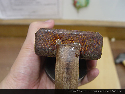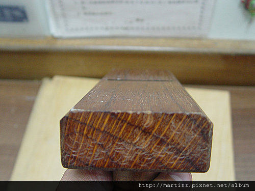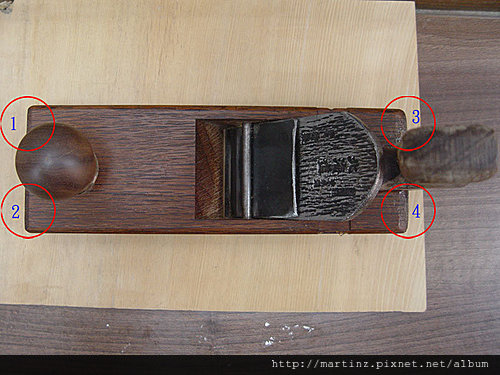 傳統中式刨刀敲刨刀一共有四個點,先將刨刀敲到接近,然後敲壓鐵固定,再來就靠前後側平面的端點來微調刨刀,我的刨刀只是加上把手,所以有點不一樣。