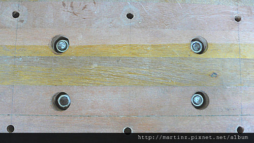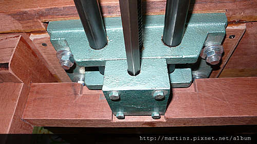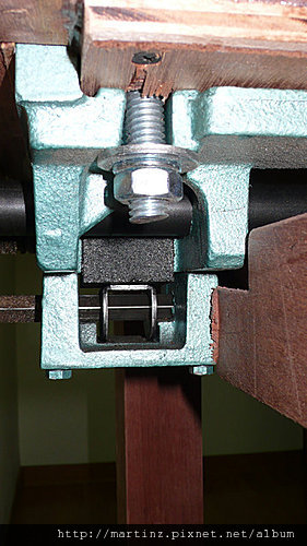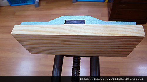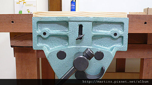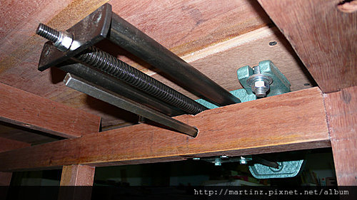 工作夾的下方為了補強,特別加鎖 1 cm 的三夾板,工作夾的彈簧桿下方方形的這一隻會影響到長撐,所以要先鑽孔讓他可以前後移動,中間的螺桿也會與長撐相接觸,問題不大,用鑿刀將長撐切出一個缺口,減少磨擦即可。