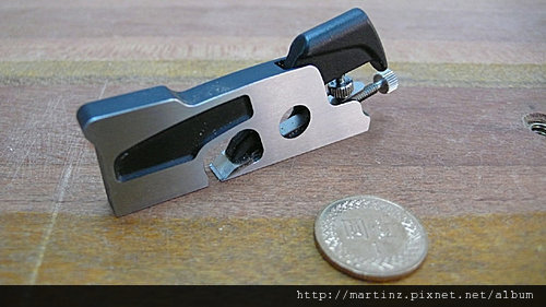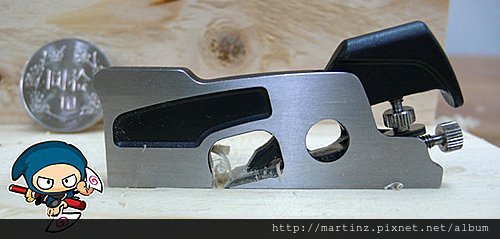 就像是間諜的小工具,是忍者執行任務的好工具,真的很小,跟十元比起來真的很小巧,可以隨身攜帶,愛刨到那就刨到那,保証您一定會愛上它,是忍者的必備武器,你一定以為他是裝飾品,女生都很想把他裝上鍊子,當項鍊來帶,可是他真的是工具1/4英寸0.63cm,用來修溝槽內的平面,很精巧的刨刀,跟大隻的Shoulder Plane一樣有控制螺絲,可以推出刨刀,刀片是25度。
