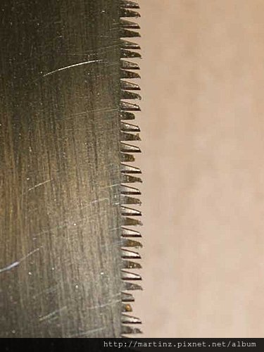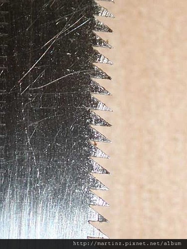 橫斷鋸就像在剪東西,像剪刀橫向的拉扯,將木料的維管束鋸斷,所以鋸齒比較細密。