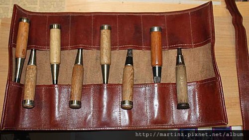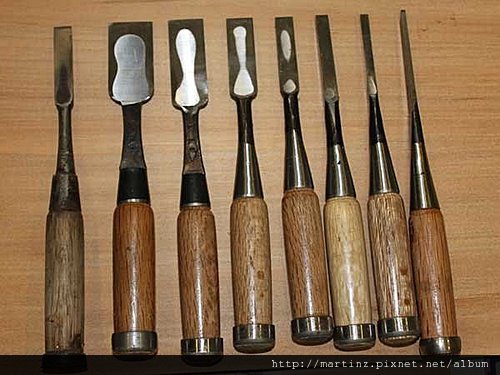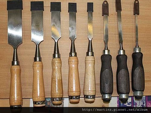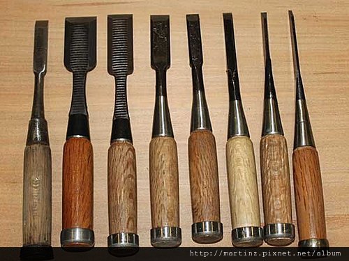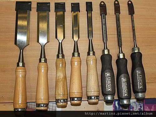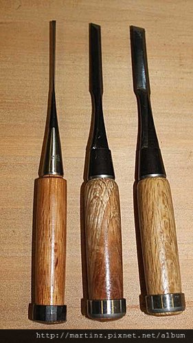 西式鋼鑿,在五金店很容易看到,為了要方便機械生產,整隻鑿刀都用鋼來打造,用機械研磨,買起來並不貴,但是小尺寸的鋼鑿不好買,所以右邊三隻是跟著國外工具一起買回來。