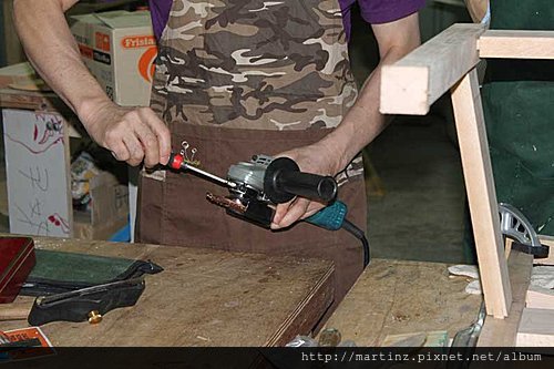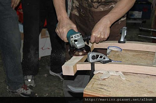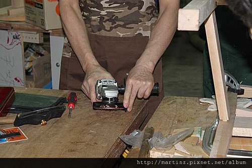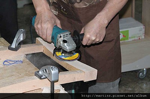 砂輪機的磨砂片,用金屬的磨砂片,主要是用來快速打掉木料,用來塑形用的,操作的方式是由遠往後拉,輕輕的靠上,磨掉木頭,去取出你要的造形,拖完後要抬起來,再到遠處往後拖,千萬不要往前推,不然磨砂片會切入木頭,失控,會有非常大的危險。