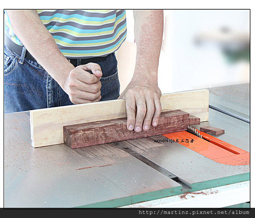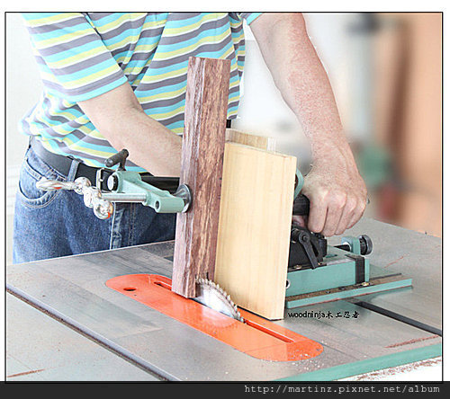 鋸片只能往一側傾斜,另一側的榫肩,就必須將木料放到鋸片的另一側,來進行,先對準再啟動推送。
