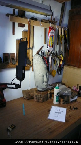 在車庫的邊邊,擺上的工作桌,上面有個佛頭是正在進行中的石雕作品。