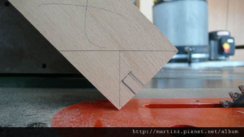 斜向的45度角,用方榫治具來切,在設定角度時先畫出與台面垂直的直線,方便用垂直角規來設定。