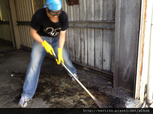 灑上去漆劑,一定要戴上手套,不然噴到就會腐蝕皮膚,痛的要命,只是真的有效,膠垢就像污泥一樣可以鏟起來。