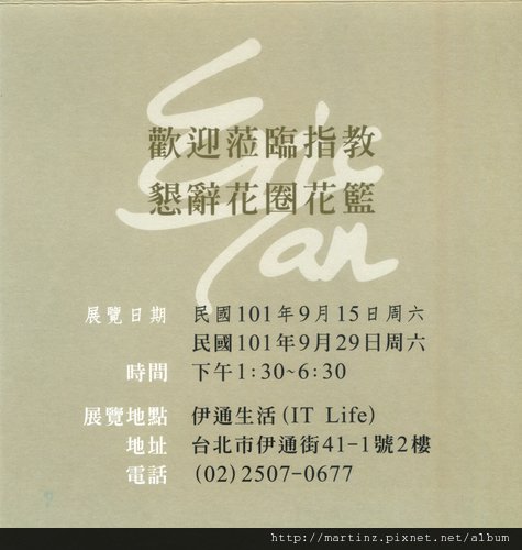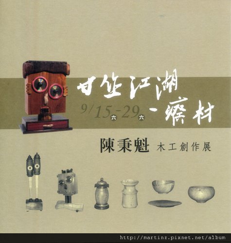 去年春節後的一次聚會,友人廖先生從中牽線,促成這次在「依通生活IT-Life」 首次個展。我是個懶散的人,去年夏天開始想為這個展覽奮發一下,結果還是難敵冷氣房與武俠小說的誘惑,倏忽間兩三個月就漂逝了。接著就是有一搭、沒一搭得 拖著、拉著,始終如內人的太極拳師傅笑稱他和我們夫妻倆是「迪化三閒」,不過他是遊戲人間的大俠,我們夫妻倆卻是真正閒閒沒事幹的閒人。我們倆對週遭友人 最大的功用,是為他們找到偷懶的良心慰藉,因為「看這兩個懶惰的人,到現在也還活得好好的,那麼偷懶一下也沒甚麼了不起。」我們看貓貓、狗狗,只要能趴 著、坐著,決不傻傻的站著。自詡為萬物之靈的我們,為什麼要像個過動兒一樣動個不停?先賢老是用蜜蜂、螞蟻當樣本叫我們勤勞,可是它們是昆蟲,我們是哺乳 類,學他們實在違反本性。內人的太極拳師傅看這兩個不成材的,就送我「甘作江湖一廢材」一詞,當作這次展覽的主題。還好「依通生活IT-Life」的劉先生是個很隨興的人,雖然知道我懶惰,還願意接受展出,實在感謝。因此,先跟各位木工先進、同好提醒,這個展覽沒幾件作品,看不到精雕細琢的工藝,只是個人的一點粗陋想法野人獻曝而已。倒是找一段時間、找一個地點,跟大家喝杯茶、聊木工才是真的。