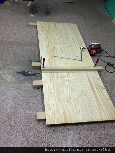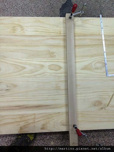 劃好線之後,先將木料靠齊在畫的標線上,前後夾上F夾,要特別注意F夾不能擋在圓鋸機的動線上,所以圓鋸機在木條的左邊切過,所以F夾要移到右側。