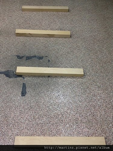 要用手提圓鋸機切出橫斷之前,一定要注意手提圓鋸機不能直接切到地面,要讓手提圓鋸切割版料前先在地面部署角料,中間兩隻要靠近切割線的左右兩側,再板料的兩側還要加上兩隻,避免圓鋸機切斷後木料直接翹起來,這樣有可能夾到鋸片,也有可能傷到木料或是操作者本身。
