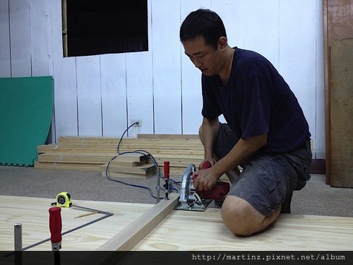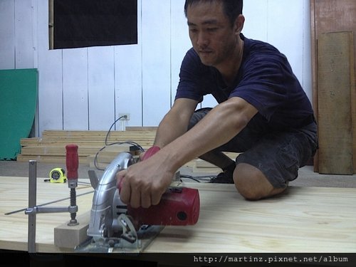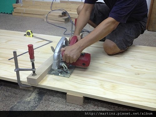 板料切割時寬度有90公分,我的雙手並不能推過,所以可以將膝蓋跪在板料上,順暢的推送圓鋸機一直到切斷板料為止。