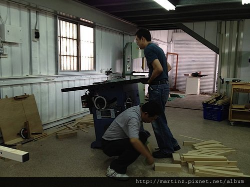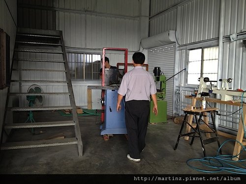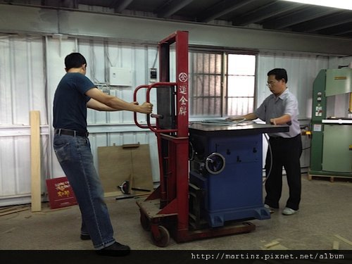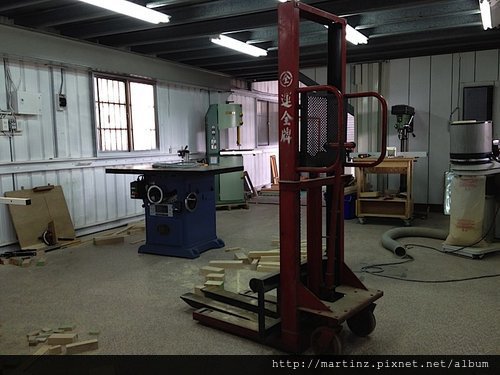 圓鋸機的底盤太低,只好要用木塊墊住,材方便起重機退出。