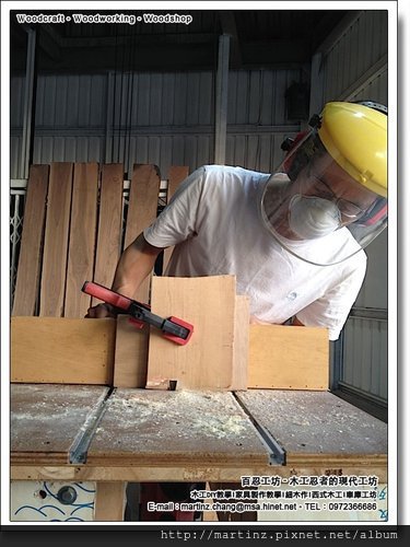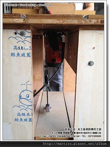 銑削台是哈莉貓木工講堂陳老師的設計,治具主要是用來固定機器,還有固定工作物,電動工具馬力強,動能大,如果不固定起來會發生很嚴重的危險,雕刻機有上萬的轉速如果不固定再使用,危險性非常高,透過銑削台來做鳩尾榫是很方便的,唯一受到的限制是刀頭的大小,但是要做大量的抽屜這個方法是一定要派上用場的,左右翻一次、上下翻一次、再左右翻一次,同一個設定點可以修四個跟銑刀一樣的缺口,三等分的榫頭一次到位,5個抽屜一共20排的榫頭,當然還有20排的榫孔,若是用手工一定翻臉,找個有效率的方法,快點做出來。