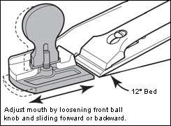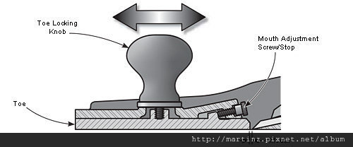 傳統的木刨並沒有開口調整的裝置,這隻鋼刨的前把手可以旋鬆來調整前段刨膛,可將開口調整到你需要的寬度。
